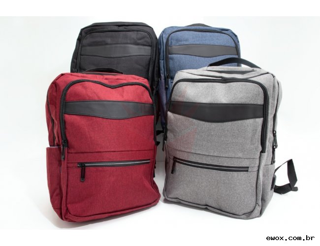 Mochila de nylon com compartimento principal com bolso para notebook 15.6 polegadas, possui divisórias para documentos e caneta, compartimento frontal com abertura vertical, bolsos laterais com revestimento interno emborrachado e dispositivo com entrada USB na parte externa, seu cabo USB acoplado internamente permite a conexão de um carregador portátil na área interna e a conexão de um eletrônico na área externa, viabilizando a carga e utilização do eletrônico enquanto caminha. Contém zíperes preto, faixa emborracha na área inferior frontal, alça horizontal para encaixe em malas de viagem, alças para costas ajustáveis com revestimento anti-transpirante e duas alças de mãos em nylon, sendo uma delas com revestimento interno.