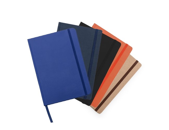 Caderneta tipo moleskine em couro sintético com capa lisa, fita elástica para fechar e fita ?marca página? em nylon. Possui aproximadamente 80 folhas amarelas sem pauta.