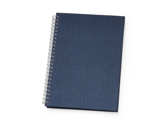 Caderno pequeno com frente e verso liso, pintura texturizada e wire-o prata. Possui: folha/envelope plástico, dados pessoais e comerciais. Tem aproximadamente 100 folhas brancas pautadas.