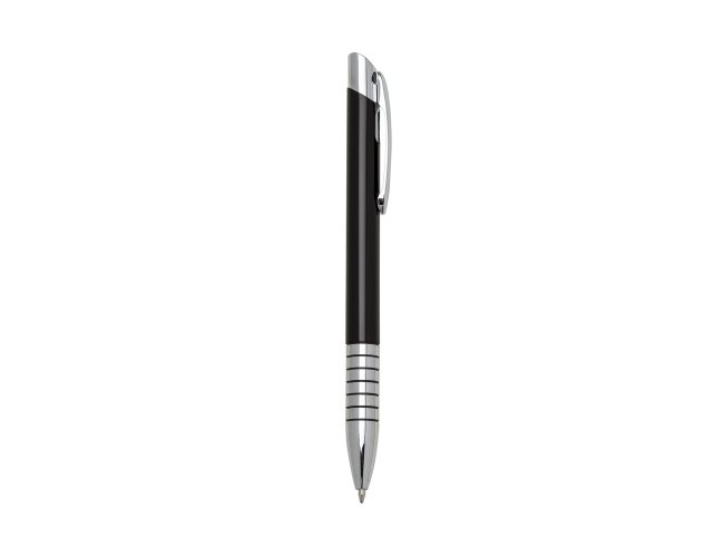 Caneta metal colorida com detalhes prata. Clip de metal, possui seis anéis pratas na parte inferior com relevo preto entre eles, Aciona por clique.