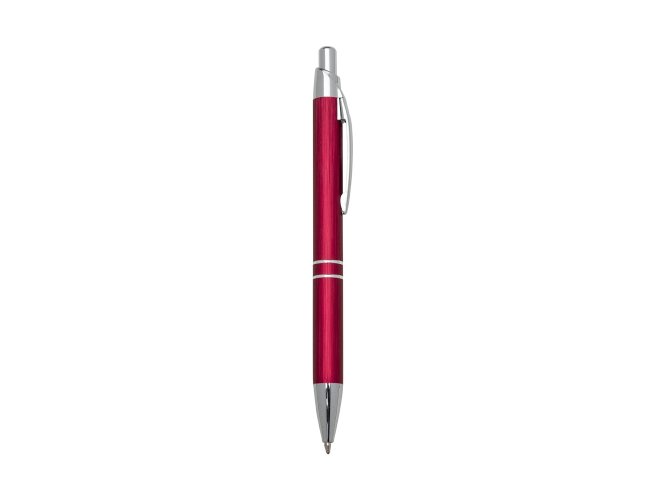Caneta metal inteira colorida com detalhes prata, pintura tipo escovada. Clip metal e dois anéis centrais prata. Aciona por clique.