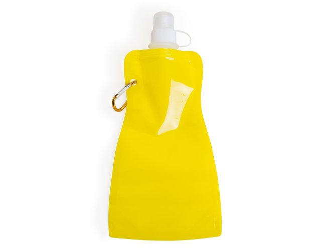 Squeeze dobrável de plástico com 480ml. Squeeze colorido acinturado com mosquetão superior de acordo com a cor do squeeze, possui tampa de bico texturizada e protetor plástico para o bico(com alça).