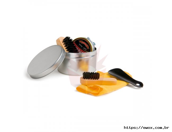 Kit de limpeza de sapatos. Com 6 peças: 1 cera incolor para sapatos, 1 flanela amarela, 2 escovas em madeira, 1 calçadeira e 1 embalagem lata.