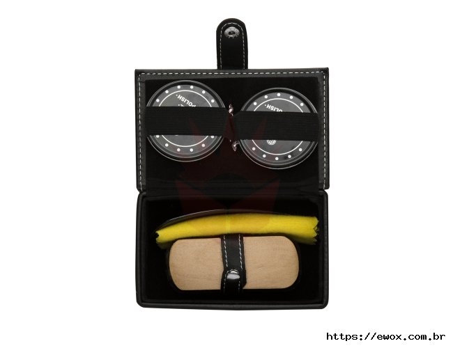 Kit engraxate estojo em couro sintético com 5 peças, costura branca e botão para abrir/fechar. Possui cera preta, cera incolor(suporte da cera em metal, para abrir basta girar a trava), calçadeira, flanela amarela e uma escova(acompanha proteção plástica). Parte interna com dois elástico para encaixar as ceras e suporte com botão para prender a escova.