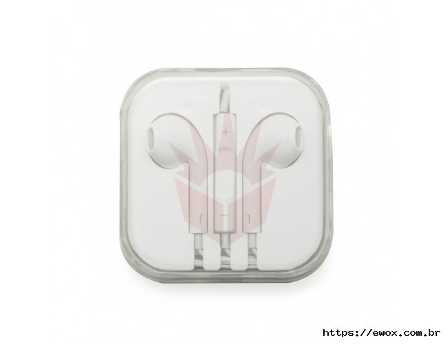 Fone de ouvido estéreo com microfone e controle de volume. Fone de ouvido plástico na cor branca, entrada P2, possui indicativo L(left) e R(right) na área interna do fone, detalhes internos vazados no fone(possibilita a visão da tela de proteção), microfone acoplado no suporte com desenho indicativo e no verso do suporte controle de volume com desenho indicativo – e +. Acompanha embalagem plástica branca com tampa acrílica transparente. OBS.: Botões de volumes funcionam apenas em aparelhos da linha APPLE.